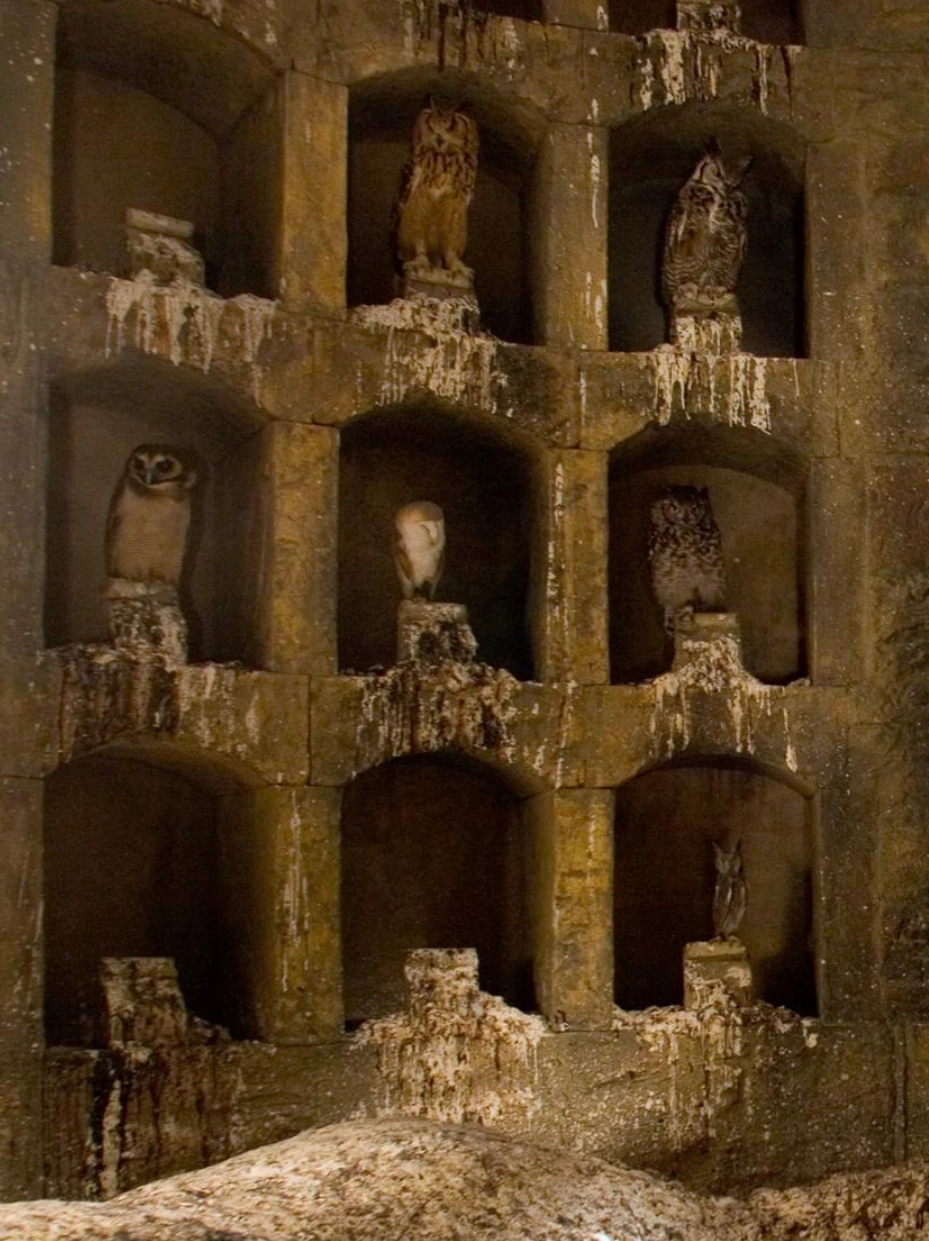 | Совы всех мыслимых пород сидят ярусами на жердочках до самого потолка, он же крыша башни. Почти все спят, и все-таки отовсюду нет-нет и глянет на него круглый янтарный глаз. |