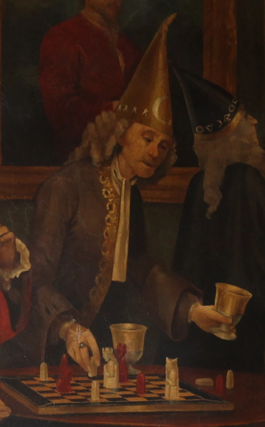 На картине Стамп наблюдает за игрой Подрика Пилса и Урика Оупли в волшебные шахматы, пока Малдун Крэгг стоит и читает книгу за его спиной. Стамп изображён в зелёной мантии и соответствующей остроконечной шляпе, на голове у него напудренный парик.