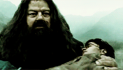 Hagrid carrying Harry Potter's supposedly dead body back to Hogwarts Castle