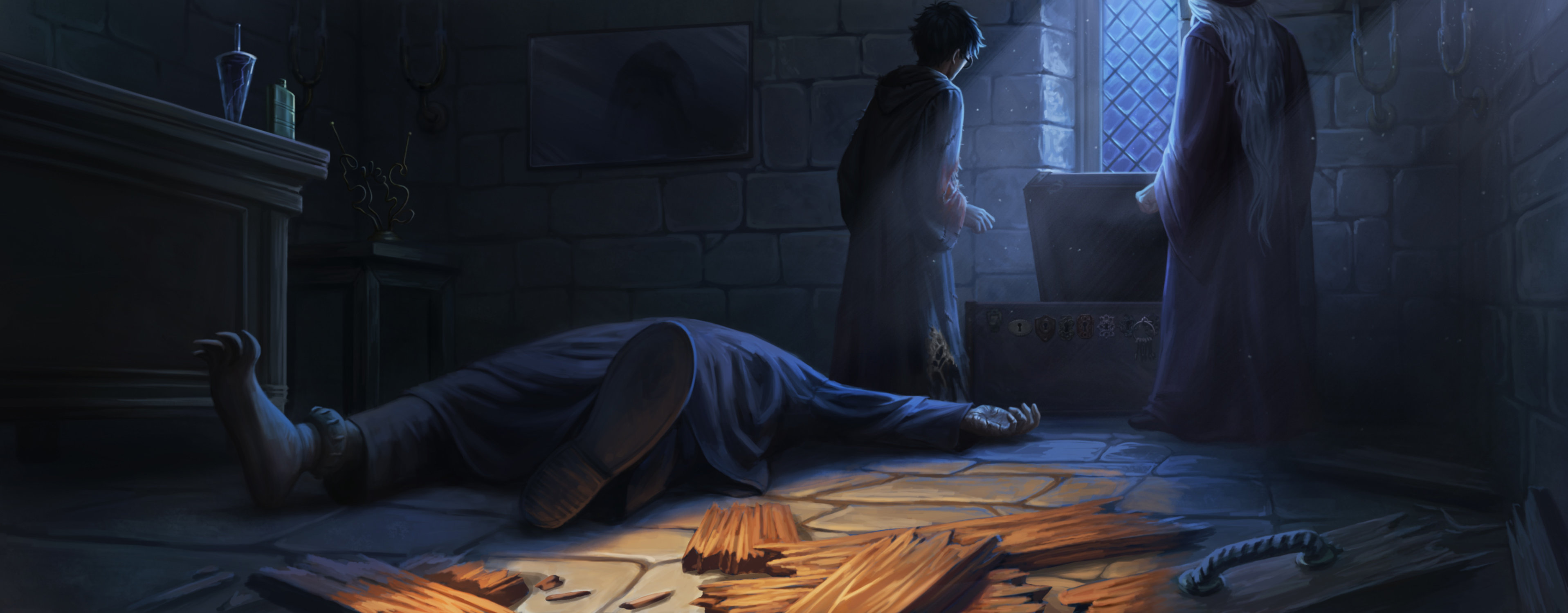 At some point early on in his teaching career, Albus became aware of the existence of an ancient magical artefact of unknown origin within the school; a looking-glass with a grim history that was far more revealing than most.[40] Having once been kept out in the open where hundreds of people could discover the apparent delights of the Mirror of Erised,[40] it had since been given a new home after a large number of them had become so entranced by what they had seen as to waste away before it. Some had reportedly even gone mad; not knowing if what it showed them was real or even possible.[40] He eventually found it, however, safely tucked away in a hidden room on the uppermost floor of the castle that would only reveal itself to someone if they were in great need of it.[41] The device, however, which upon closer examination turned out to have been bewitched with the tantalising power of showing those who stared into its surface a vision of their heart's deepest desire,[40] proved interesting rather than useful.[42] Intrigued by the mirror as a fascinating piece of magical ingenuity, Albus was nevertheless painfully aware that his greatest yearning at the time was for something impossible, and that clinging on to a wish that could never – and for obvious reasons ought never – to be fulfilled could only hurt him, Dumbledore eventually decided to leave the mirror where it was, covered by a curtain of black velvet. It would take many years before he went to visit it again.[37]