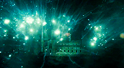 The Quidditch pitch being destroyed by Death Eaters during the Battle of Hogwarts