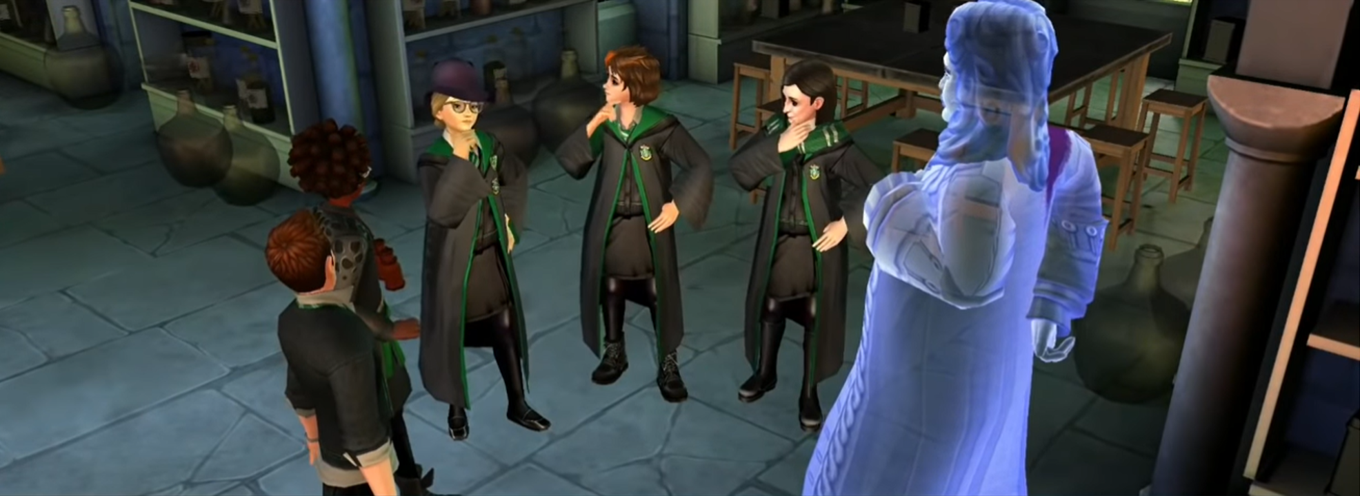 The Bloody Baron speaking to several Slytherin students in the Potions Classroom