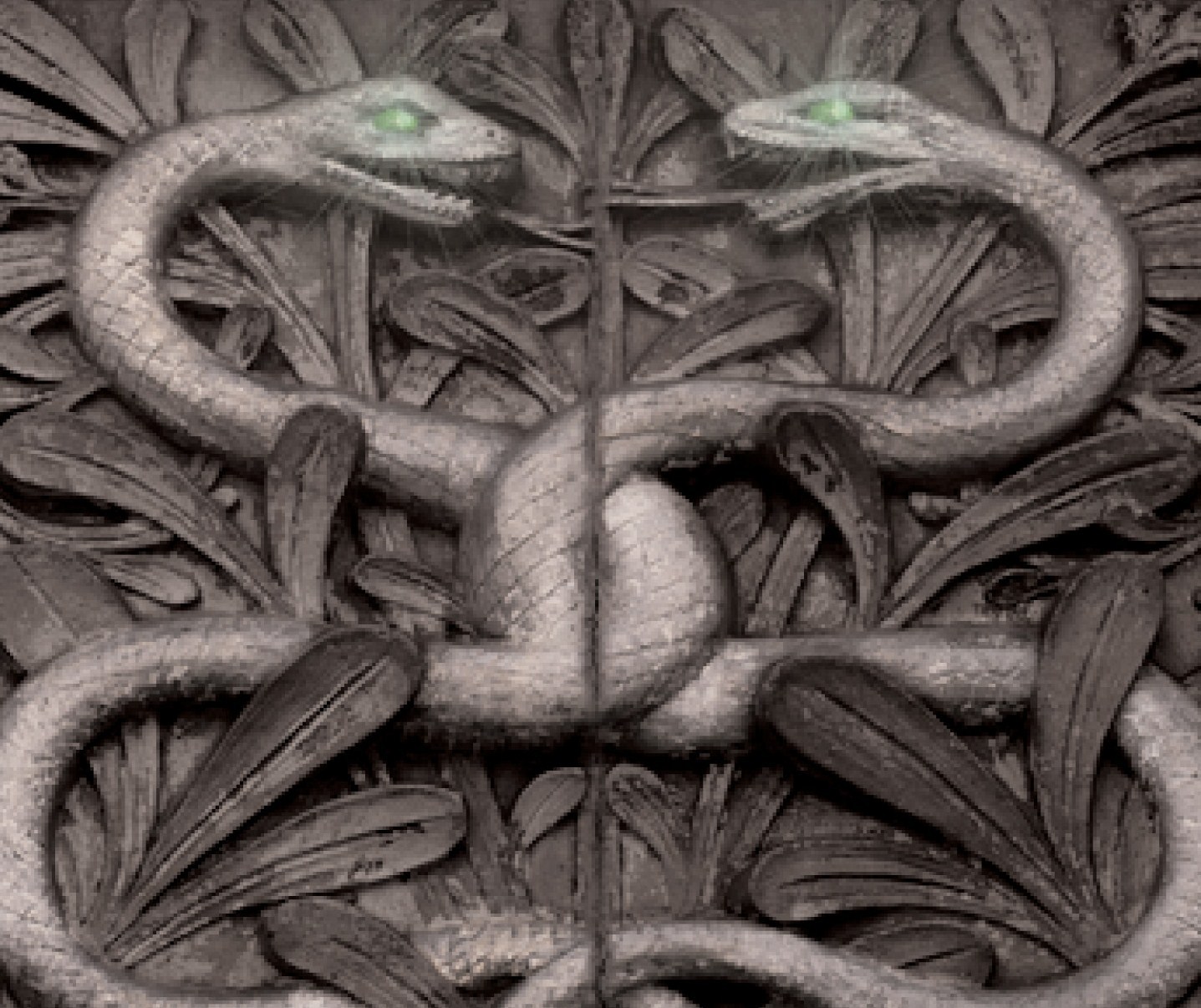 - "He was standing at the end of a long, dimly lit chamber. Towering stone pillars entwined with more serpents, rose to a ceiling lost in darkness, casting long, black shadows through the odd, greenish gloom that filled the place."