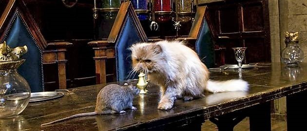 Hermione took Crookshanks to Hogwarts School of Witchcraft and Wizardry with her and he was present on the train when Dementors boarded in search of Sirius Black. Perhaps because he was half-Kneazle, the newly-adopted cat demonstrated the ability to detect frauds masquerading as animals, most notable of which being Animagi. Before the start of the 1993–1994 school year, Crookshanks attacked Peter Pettigrew in his Animagus form of Scabbers, Ron's beloved pet rat when Ron took him into the Magical Menagerie as he was looking unwell after the Weasley family's trip to Egypt.[4]