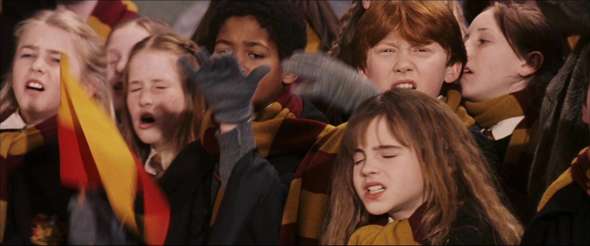 Dean Thomas with other Gryffindors watching a Quidditch match