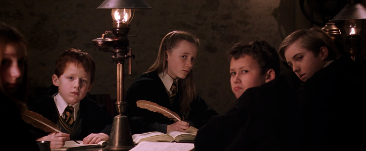 Ernie studying with other Hufflepuffs, while gossiping about Harry Potter