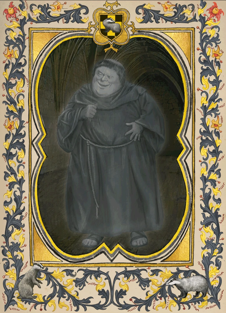 At the age of eleven, the Friar became a student at Hogwarts School of Witchcraft and Wizardry in Scotland. He was Sorted into Hufflepuff House and was taught by Helga Hufflepuff in the magical arts the seven years that followed.[6]