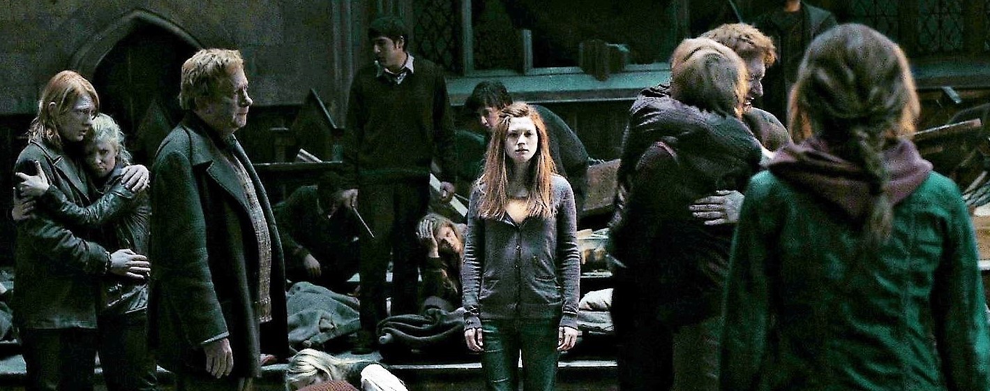Ginny, Harry, Ron, Hermione, Neville, and Luna fight off Death Eaters in the Hall of Prophecy