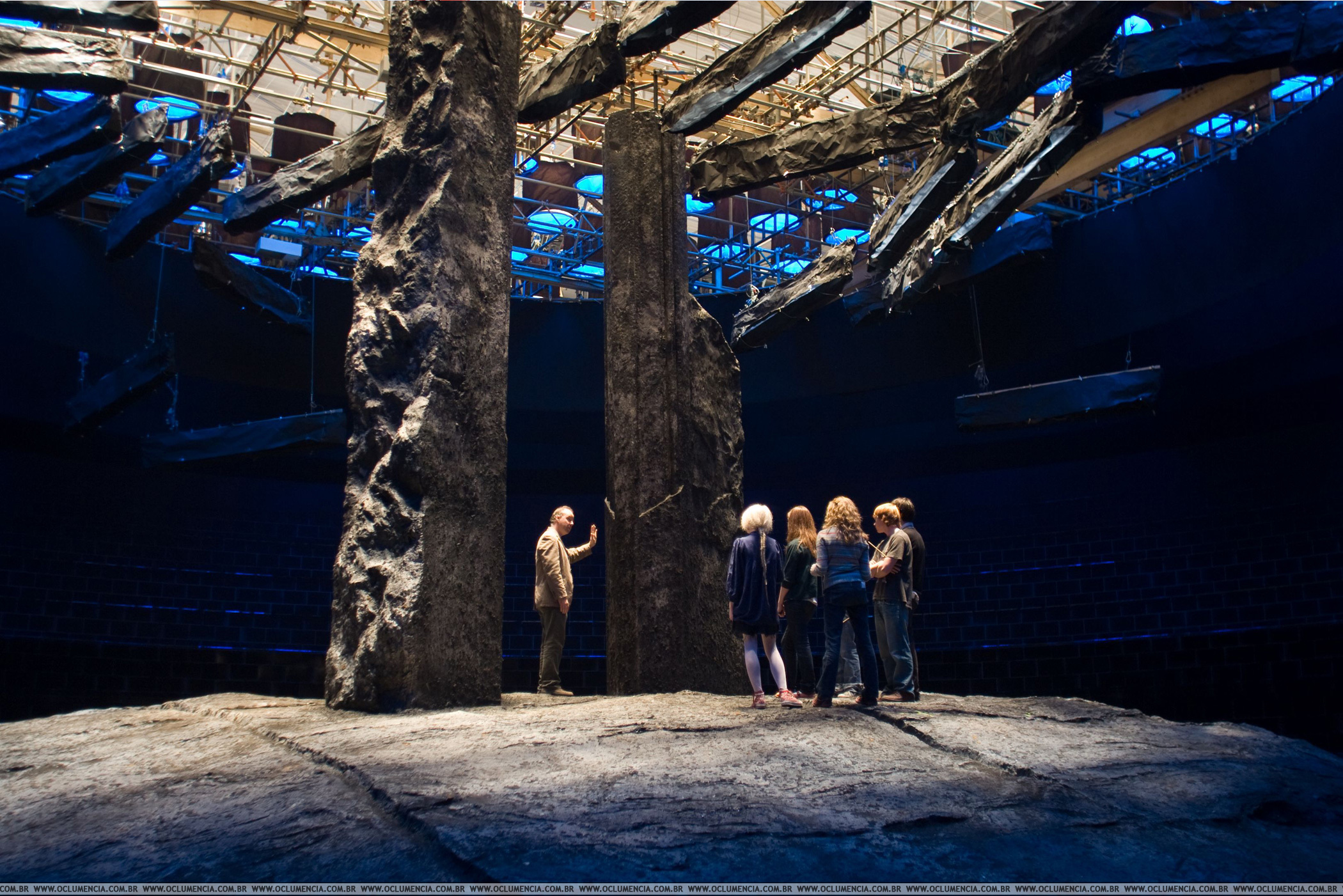 Rupert Grint, Emma Watson, Daniel Radcliffe and director David Yates on the Deathly Hallows set
