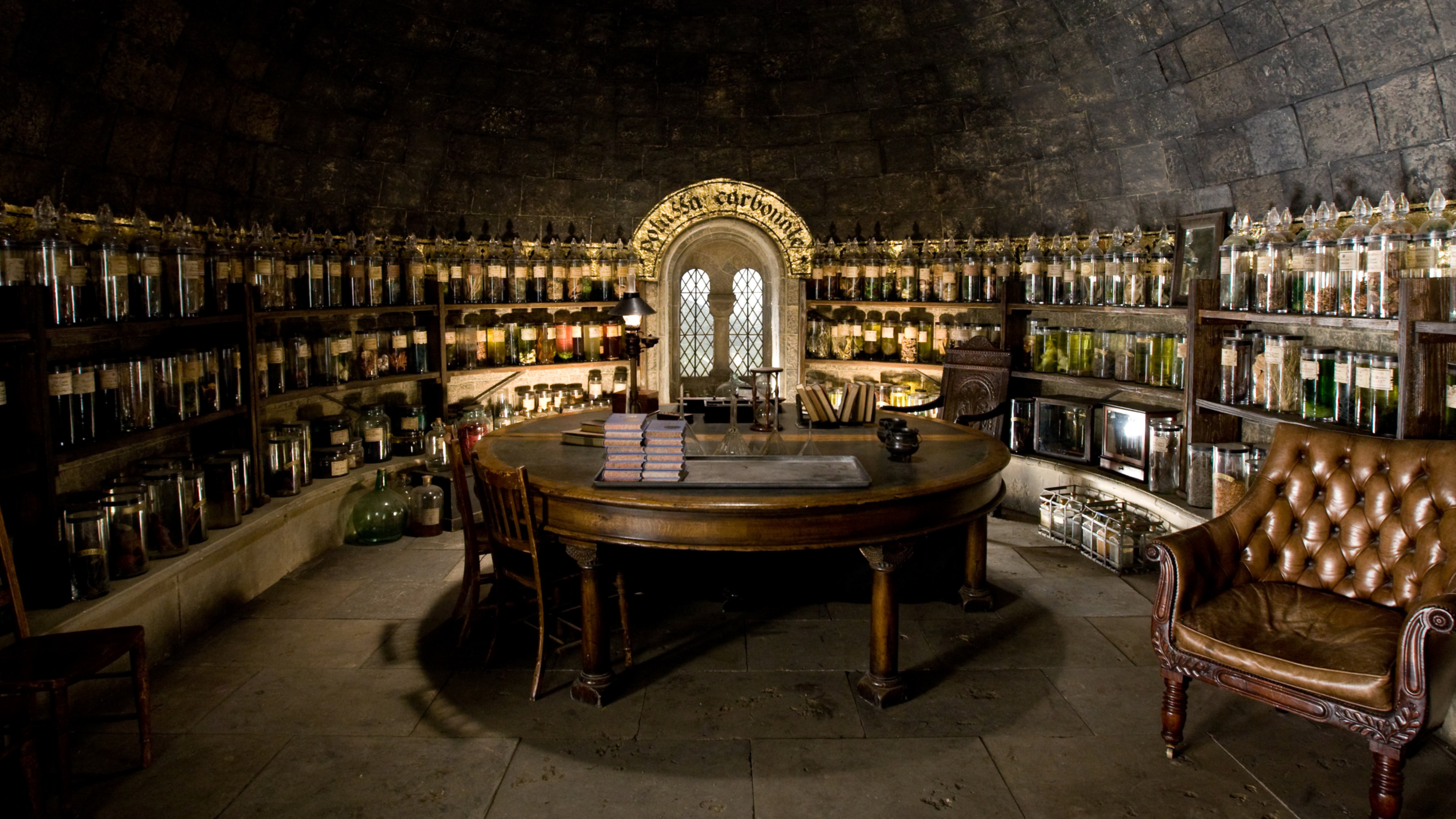 This office was used by Severus Snape during his long tenure as Potions Master at Hogwarts. It was a gloomy and dimly-lit room found in the school Dungeons. The shadowy walls were lined with shelves of large glass jars filled with slimy, revolting things, such as bits of animals and plants, floating in potions of varying colours.[32][33]