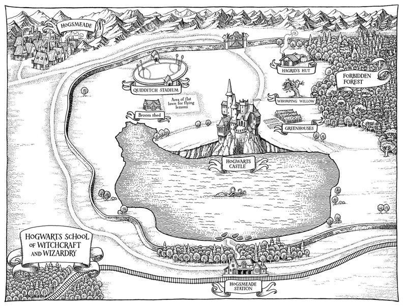 A map of the Hogwarts grounds and surrounding areas