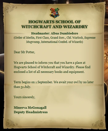 The Hogwarts acceptance letter was a letter of acceptance to Hogwarts School of Witchcraft and Wizardry, sent to wizards and witches residing in Great Britain and Ireland prior to their first year at Hogwarts.[1][3] A special quill existed, which wrote down the name and birth of every magical child at the moment they exhibited signs of magic. This allowed Hogwarts letters to be sent to all magical children at the appropriate time, even those who were Muggle-born.[4]