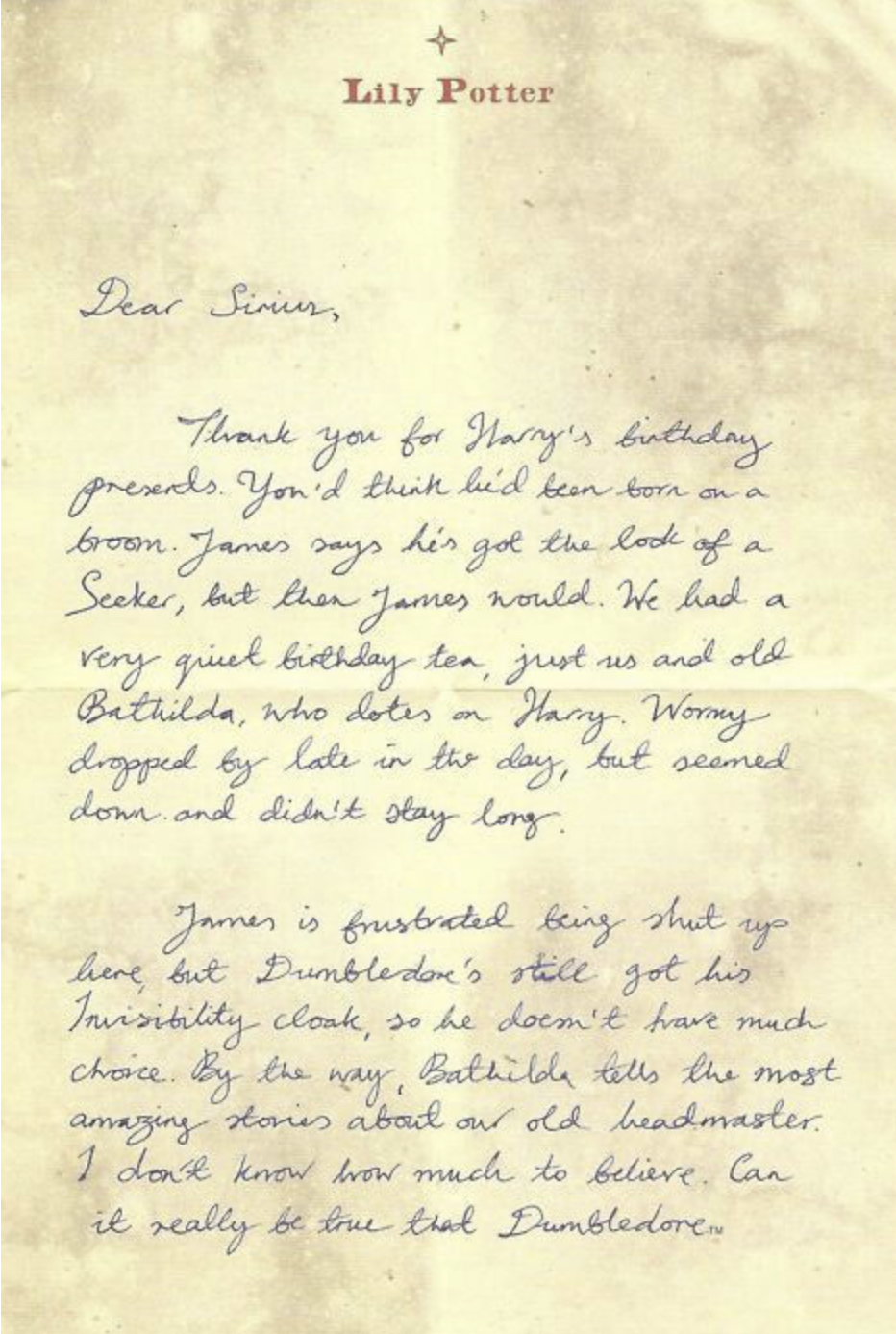 This letter was written by Lily Potter to close family friend Sirius Black in 1981, shortly after her son Harry's first birthday.[1]