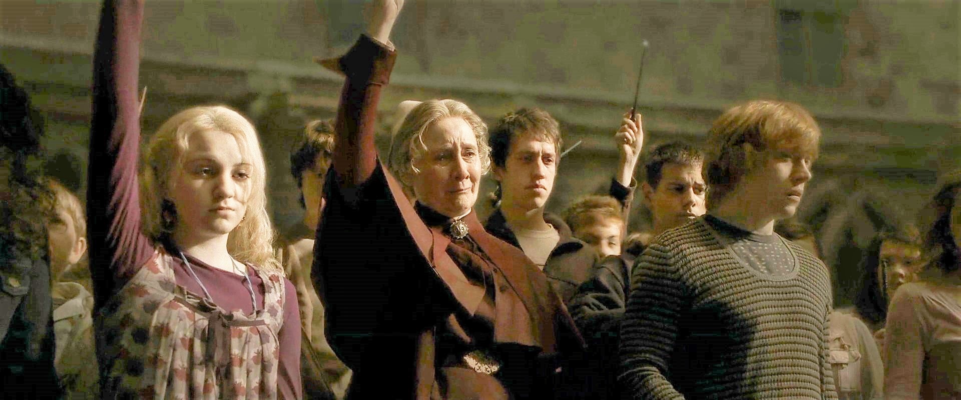 Luna raising her wand after the death of Albus Dumbledore, along with Ron Weasley and Madam Pomfrey