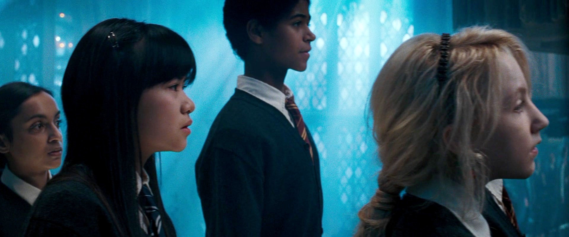 Luna standing next to Dean Thomas and Cho Chang during a Dumbledore's Army meeting