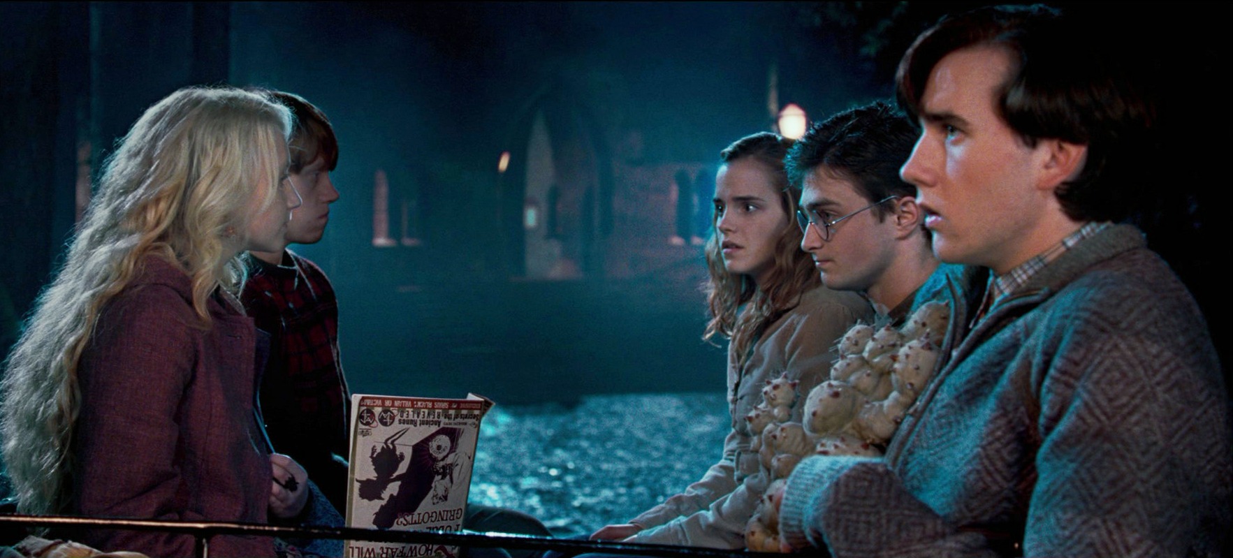 Luna on the Hogwarts Express talking to Ginny Weasley and Dean Thomas