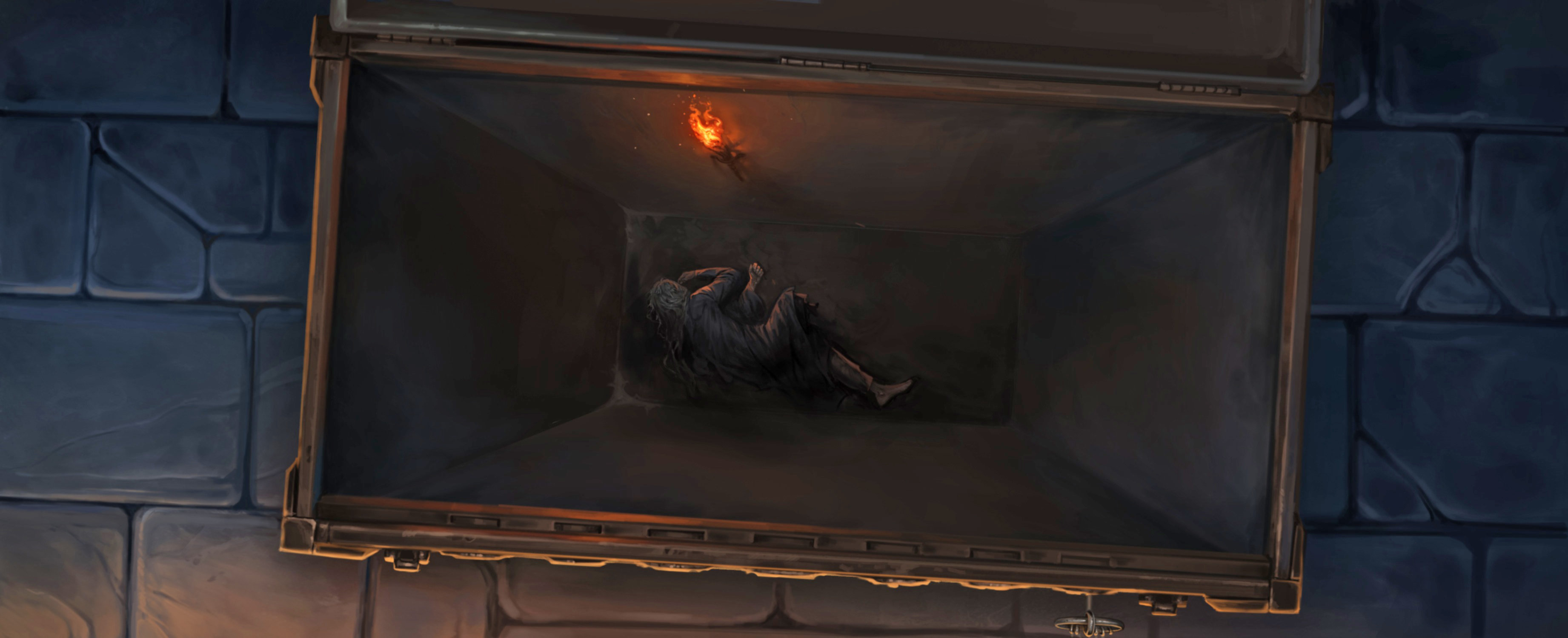 It had seven locks on it, and the trunk opened to a different assortment of objects for each lock. The first compartment contained a mass of spellbooks. The second contained an assortment of broken Sneakoscopes, parchments, quills, and a silvery Invisibility Cloak. Most notably, though, the seventh compartment was about 10 feet (3.0 m) deep (possibly because of the use of an Undetectable Extension Charm), and was where Bartemius Crouch Junior imprisoned the real Moody in 1994 to 1995.[2] It is presumably in this last compartment that Moody kept captured Dark wizards and Death Eaters for transport during his days as an Auror.