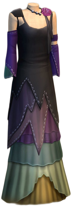 Tonks's dress robes consisted of a gradiented yellow, purple, green, and black dress, with a purple flower on her left shoulder.