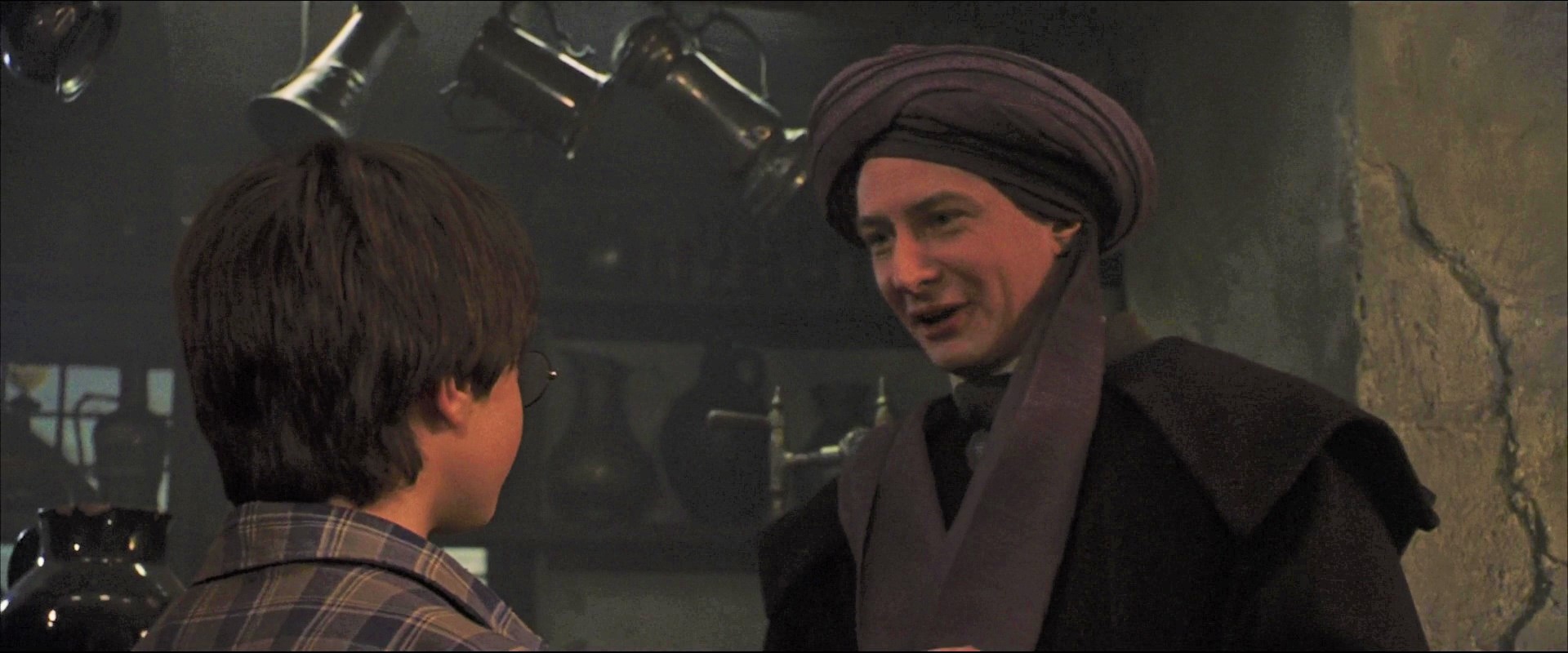 - In the novel of Harry Potter and the Philosopher's Stone, Quirrell does not appear to have his turban until after his failed attempt to steal the Philosopher's Stone from Gringotts. In the film however, Quirrell has his turban before the robbery. This change is indicated by the fact that he shakes Harry's hand at the Leaky Cauldron in the novel, but does not wish to in the film. However, not wanting to shake Harry's hand cannot be due to Voldemort sharing Quirrell's body, because as Quirrell dies, he does not understand what is happening to him (he yells, "What is this magic?!?").