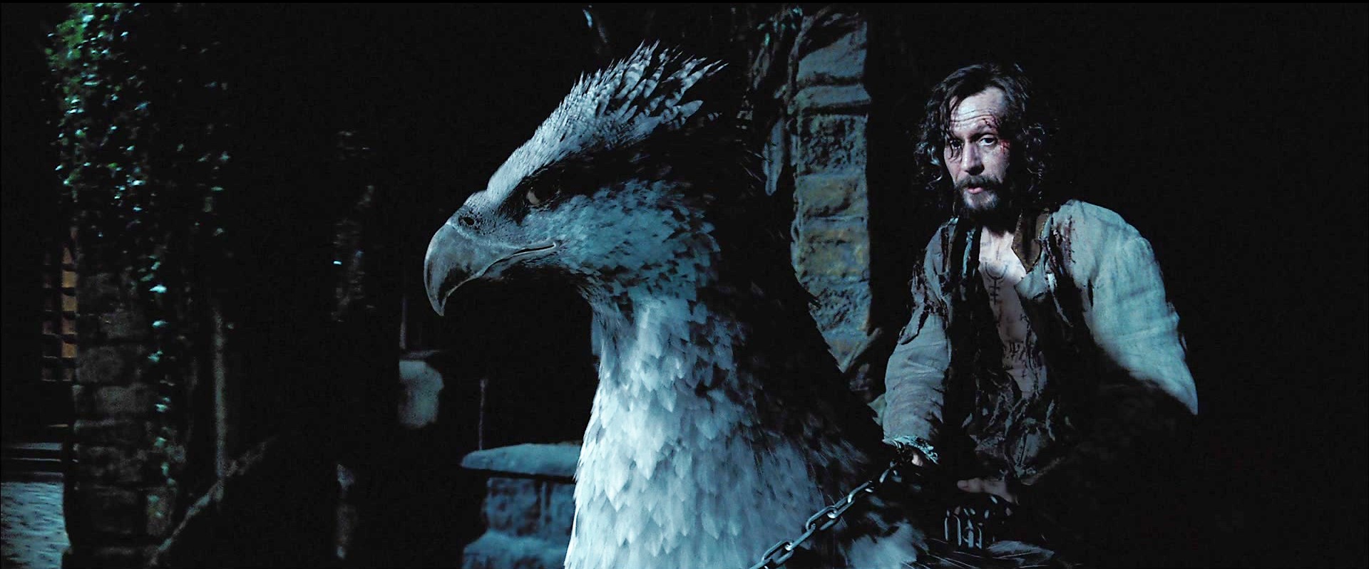 Sirius prepares to escape on Buckbeak after being rescued from the topmost tower