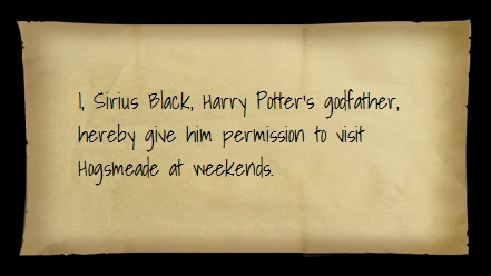 I, Sirius Black, Harry Potter's godfather, hereby give him permission to visit Hogsmeade on weekends.