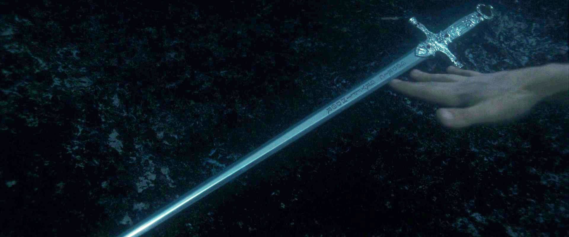 - "There have been many enchanted swords in folklore. The Sword of Nuadu, part of the four legendary treasures of Tuatha Dé Danann, was invincible when drawn. Gryffindor's sword owes something to the legend of Excalibur, the sword of King Arthur, which in some legends must be drawn from a stone by the rightful king. The idea of fitness to carry the sword is echoed in the sword of Gryffindor's return to worthy members of its true owner's house. There is a further allusion to Excalibur emerging from the lake when Harry must dive into a frozen forest pool to retrieve the sword in Deathly Hallows (though the location of the sword was really due to a spiteful impulse of Snape's to place it there), for in other versions of the legend, Excalibur was given to Arthur by the Lady of the Lake, and was returned to the lake when he died."[1]