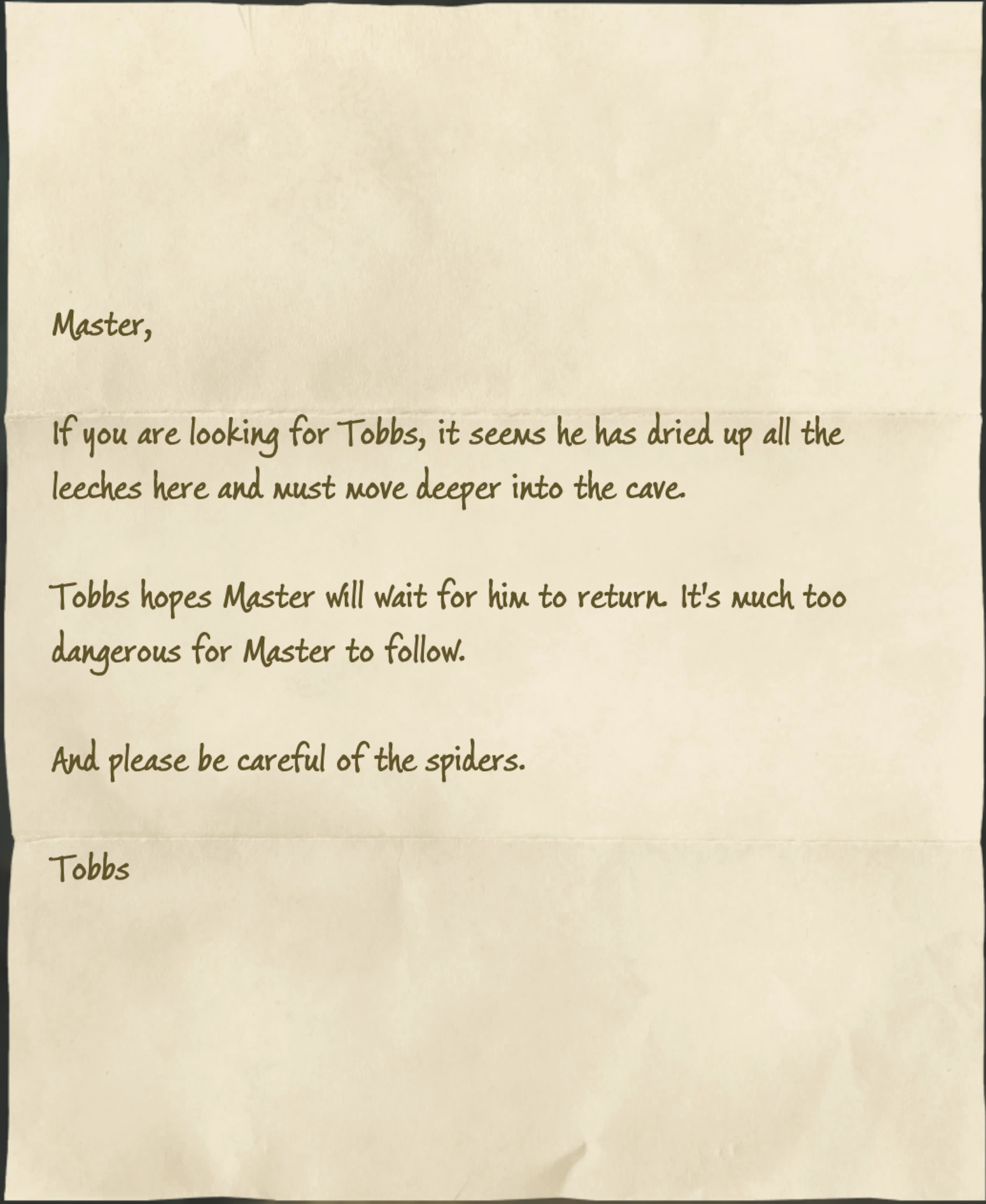 These letters were written between the house-elf Tobbs and his second master regarding his work collecting leech juice within Spinners Cavern.[1]