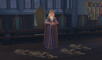 Dumbledore again charmed this group of skeletons for Hallowe'en between 1984 and 1991. During one year, Ismelda Murk, who had just survived being attacked by a large group of skeletons she had animated from Godric's Hollow graveyard, was scared by this troupe of skeletons, which her friends found very funny.[4] During another year, one of the skeletons somehow managed to gain possession of a cursed sword which compelled all who wielded it, alive or dead, to fight others. Jacob's sibling had to rescue Argus Filch and Mrs Norris from this skeleton.[5]