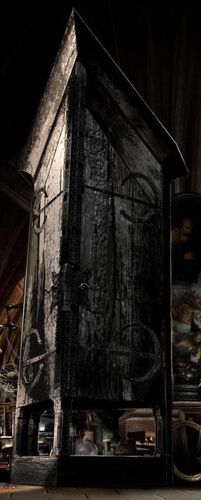 A pair of Vanishing Cabinets would act as a passage between two places. If an object had been placed in one, it would appear in the other.