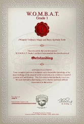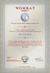 | 您的成功令人赞赏,不少与您一样的男女巫师都没有通过!我们很高兴地通知您,您值得尊敬地以优异的成绩通过了考试。我们真切希望您能参加在不久后进行的W.O.M.B.A.T.第三次,也是最后一次测试。非常出色! | You have succeeded admirably where many of your fellow witches and wizards have failed! We are delighted to inform you that you have passed with distinction and honour. We would most earnestly recommend that you proceed to the third, and final, W.O.M.B.A.T. in due course. Very well done indeed! | |