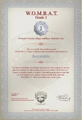 | 我们遗憾地通知您,您没有通过一级W.O.M.B.A.T.测试。我们建议您对课本(哈利·波特1-6)进一步学习。如果您想再试一次,二级W.O.M.B.A.T.测试将在不久后进行。 | We are sorry to inform you that you have failed your Grade 1 W.O.M.B.A.T. A little further study of the textbooks (Harry Potters 1- 6) is recommended. Should you wish to try again, a grade 2 W.O.M.B.A.T. will present itself in due course. | |