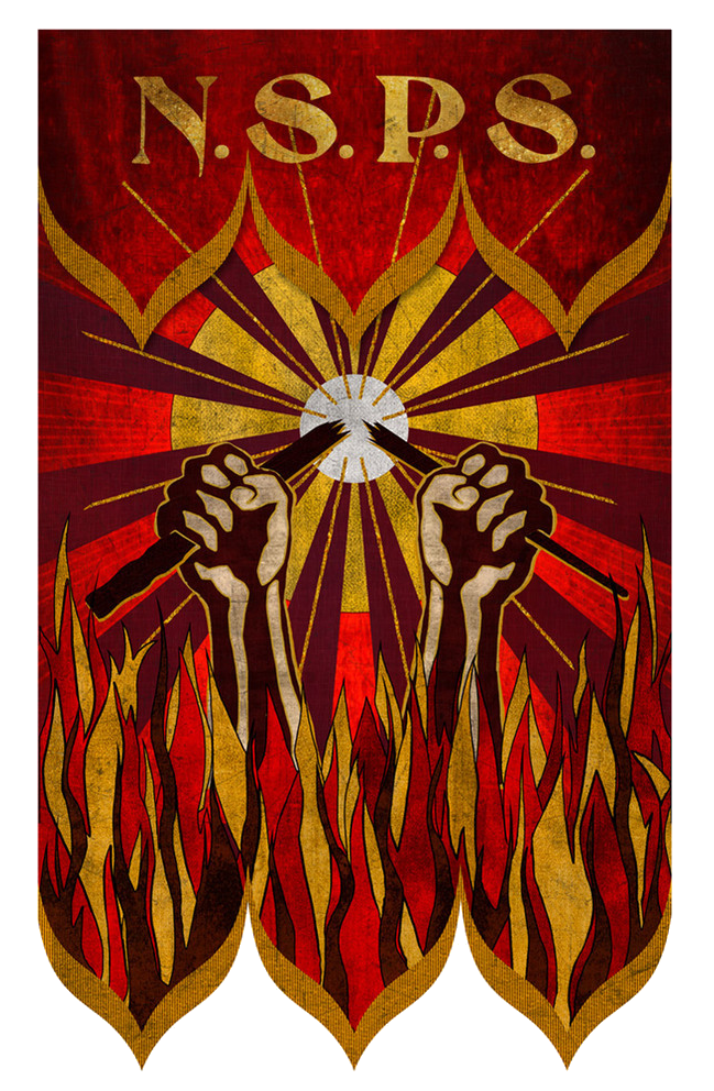 新塞勒姆慈善协会的标志是在黄色和红色的耀眼火焰中,一双手骄傲地攥着一根折断的魔杖。协会在进行宣讲集会时,会在现场树立一面印着协会标志的旗帜[1]。