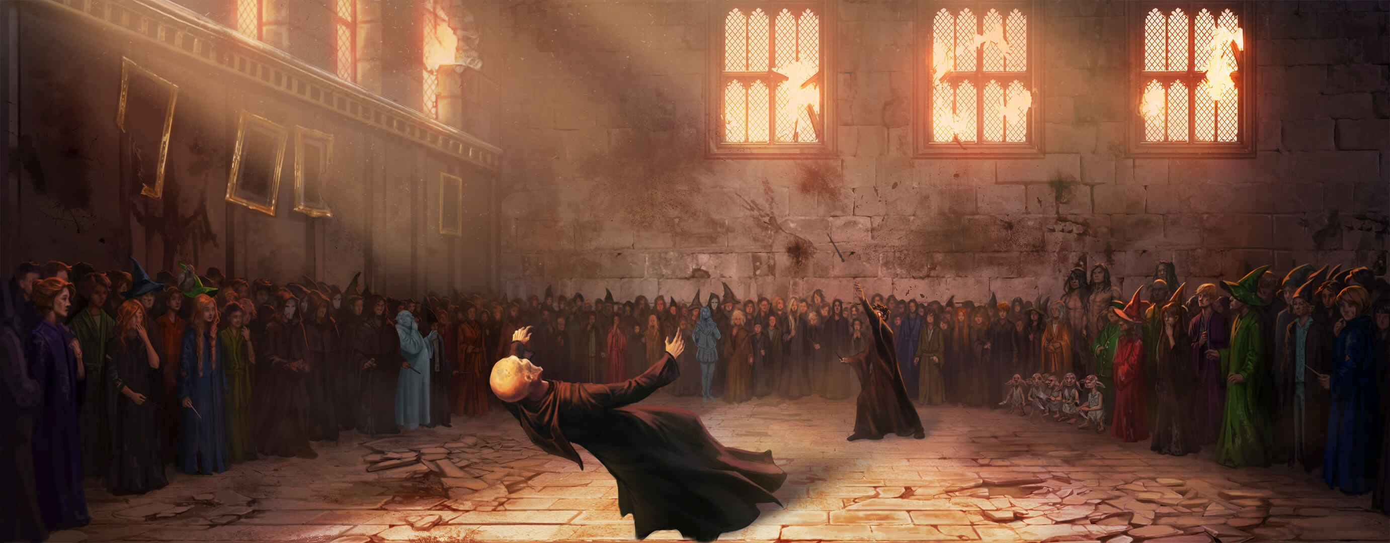 于是,哈利自愿站在了伏地魔的面前,被伏地魔的杀戮咒击中。而此时,伏地魔在哈利体内的灵魂被其亲手摧毁。由于伏地魔的体内流淌着哈利的血,因此对哈利也有魔法保护。这使得哈利再次在杀戮咒中幸存下来。两人面对面决斗,而哈利最终战胜了他[10]。