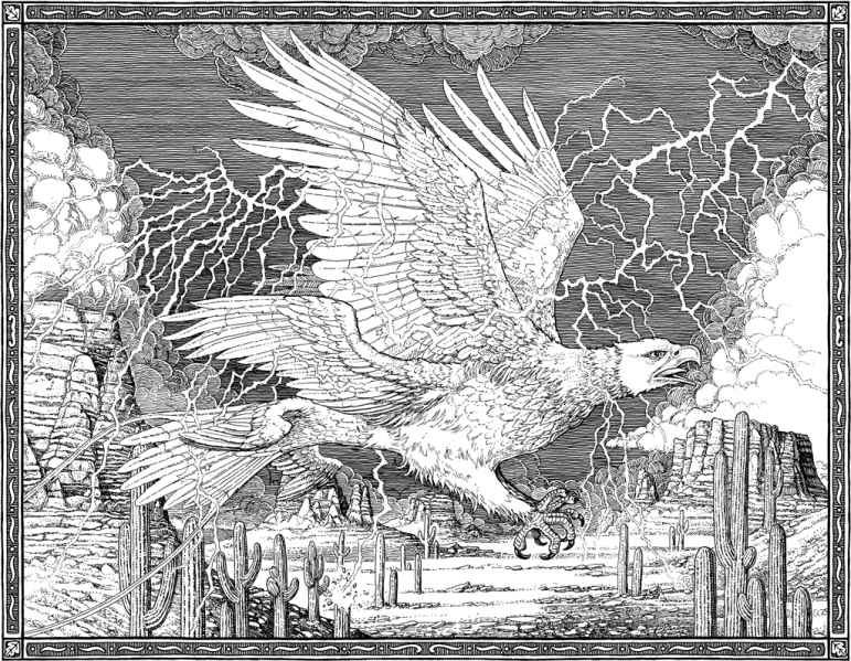 雷鸟常见于美国西部的亚利桑那州,它们与凤凰有很近的亲缘关系。雷鸟能在飞行时召唤闪电和风暴,也因这种罕见的能力经常被动物贩子盯上。